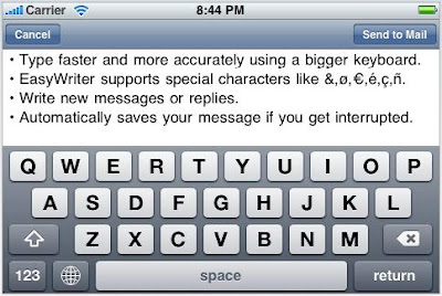 Review: EasyWriter is something that should be part of the iphone firmware, but is not. It basically allows user to type in a wide keyboard in landscape mode. It fully utilize the touchscreen spaces and makes typing on an iPhone/iTouch a lot easier. When you are done with the typing, you hit the 'Send to Mail' button to move the text to a 'New Message' screen of the mail app. As an added bonus, you can pinch and zoom to read and navigate around the text.